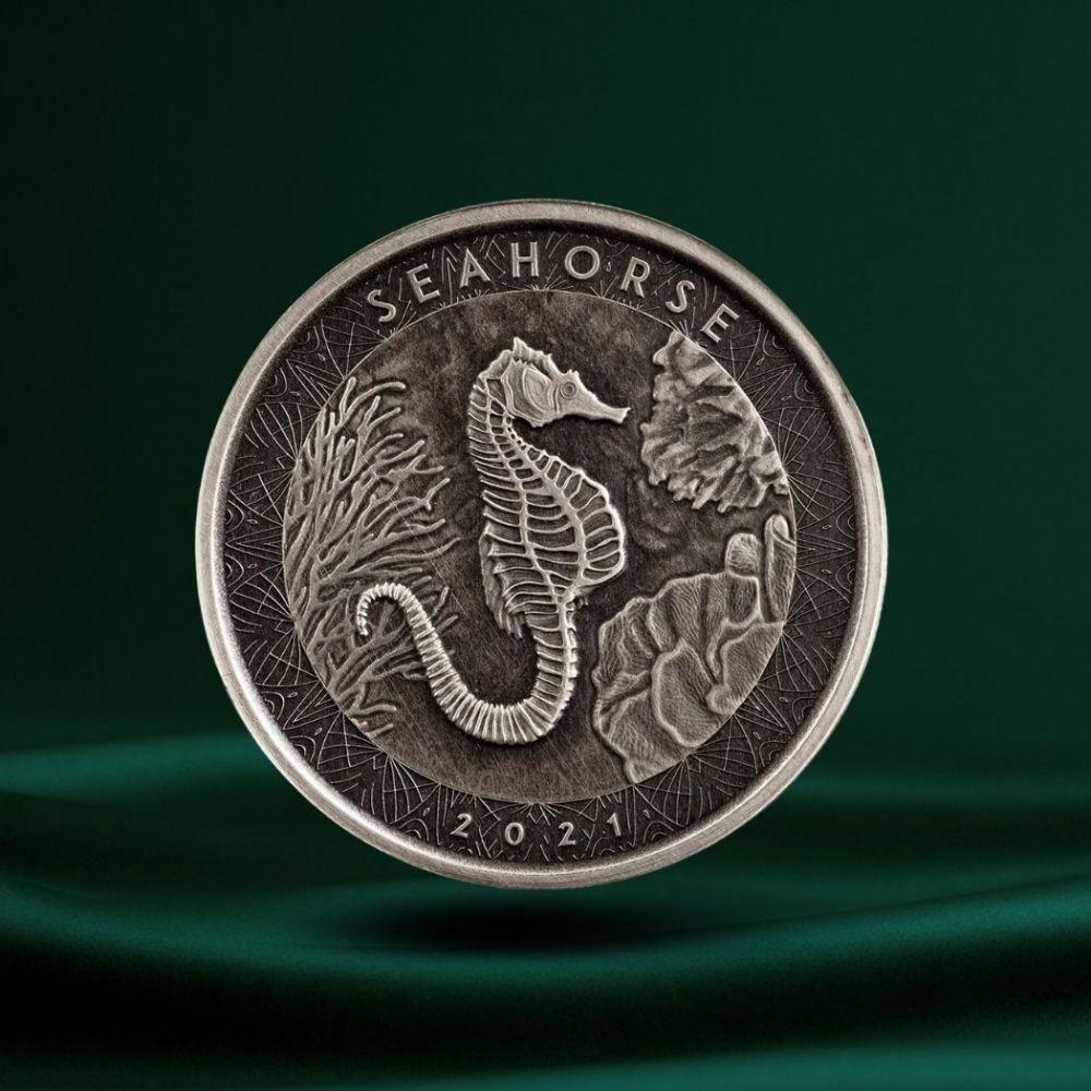 Motivet er utformet for å fremheve detaljer i Samoa Seahorse sølvmynt 1 oz Antique, noe som gjør den ekstra interessant ved nærmere betraktning.