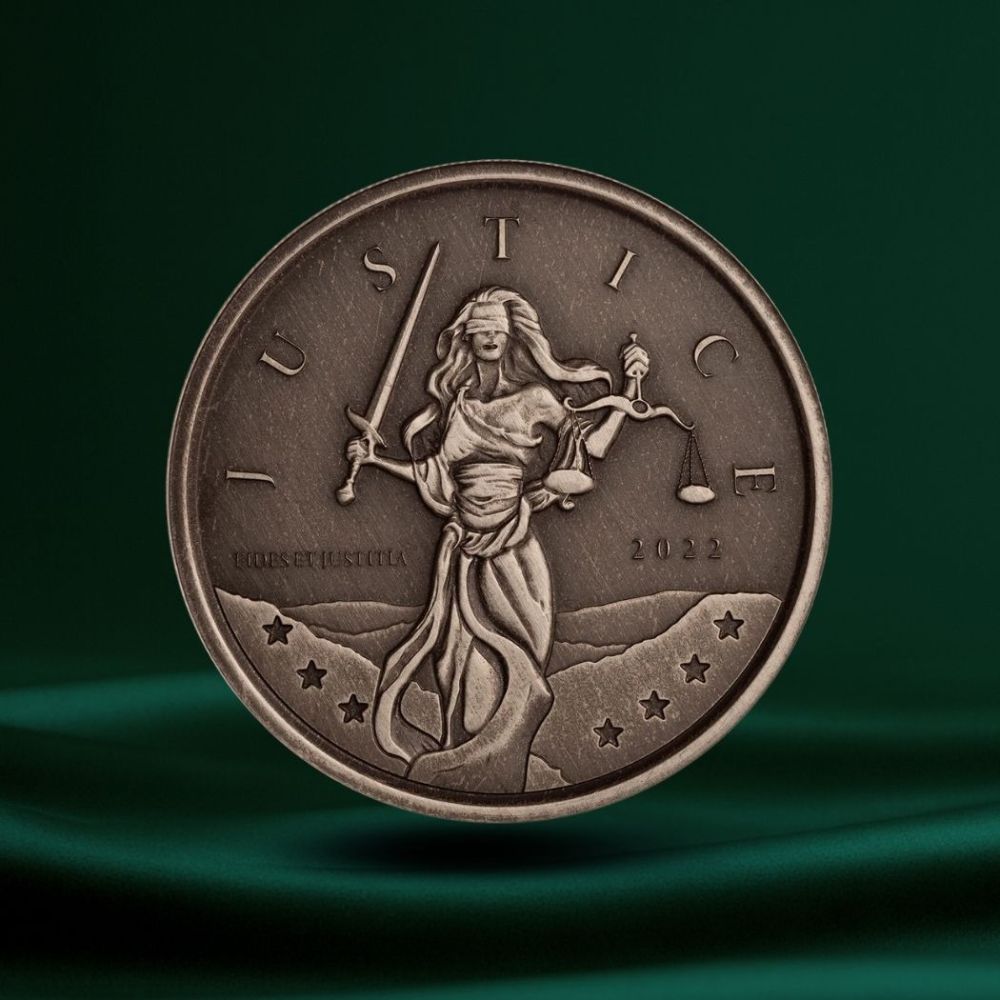 Motivet er utformet for å fremheve detaljer i Gibraltar Lady Justice sølvmynt 1 oz Antique, noe som gjør den ekstra interessant ved nærmere betraktning.