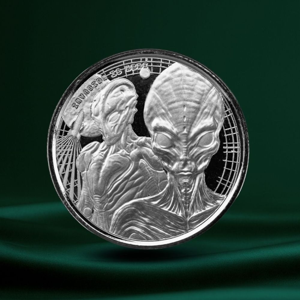 Motivet er utformet for å fremheve detaljer i Ghana Alien Invasion sølvmynt 1/2 oz Proof Like, noe som gjør den ekstra interessant ved nærmere betraktning.