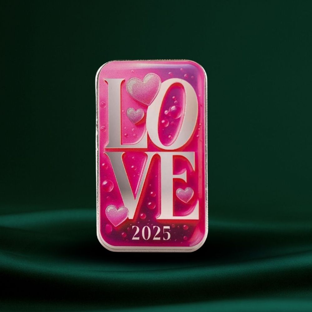 Love sølvbar 1 oz Color skiller seg ut med tydelig preg og et motiv som gjør den lett gjenkjennelig i samlingen.
